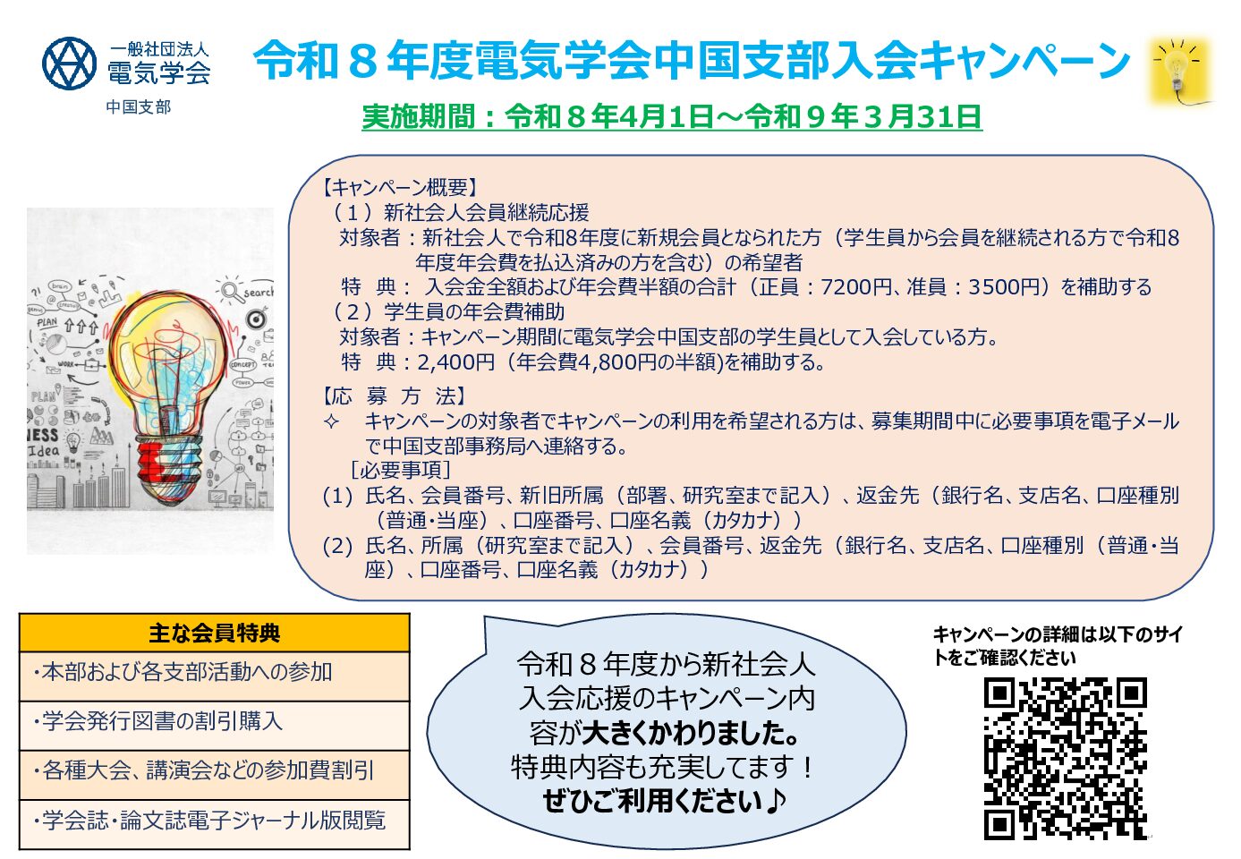 キャンペーン期間である令和8年4月1日から令和9年3月31日に電気学会中国支部の学生員として入会している学生(新規入会の方および過去に本キャンペーンを利用していない方)に対して年会費の半額(2,400円)を補助する。